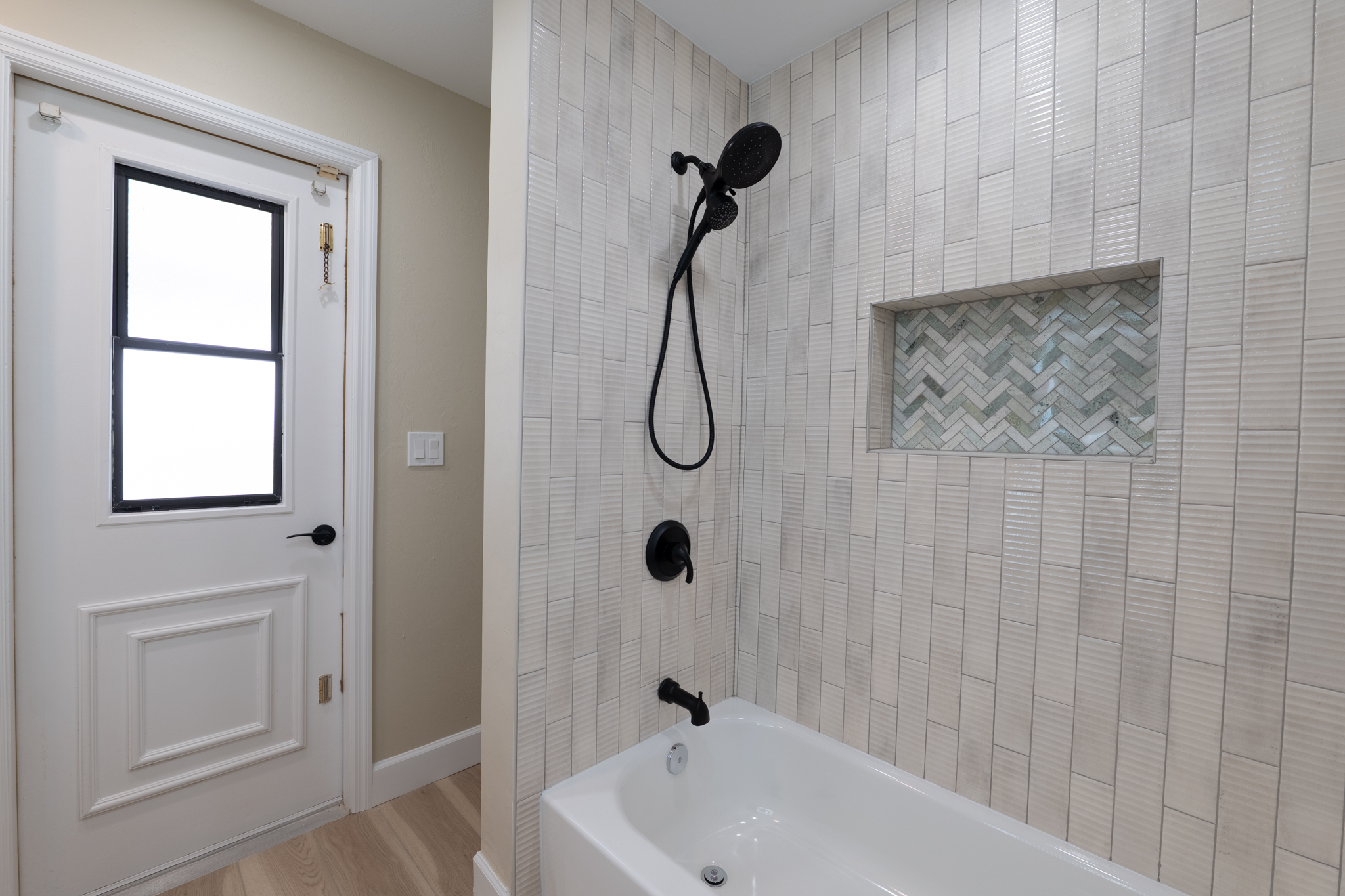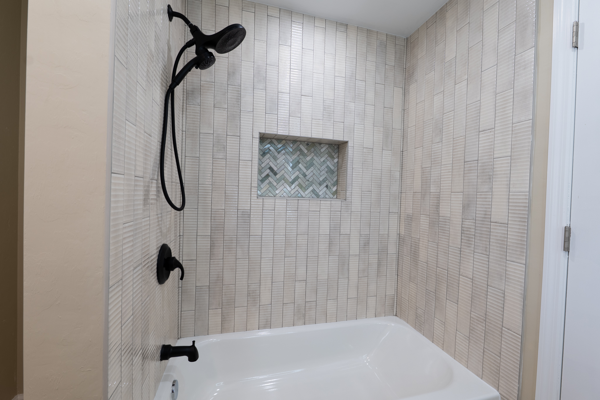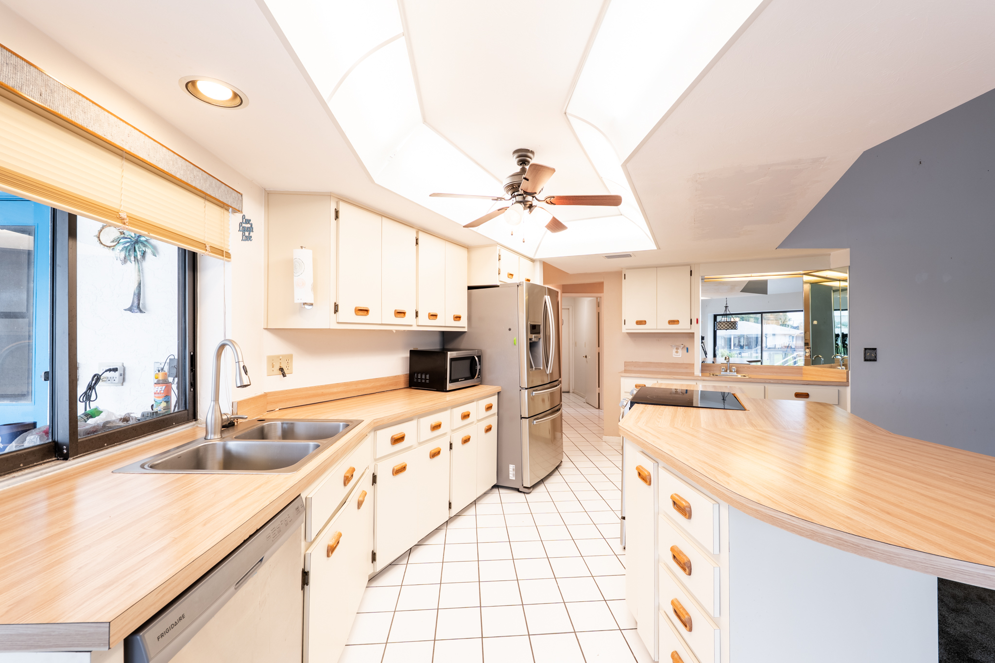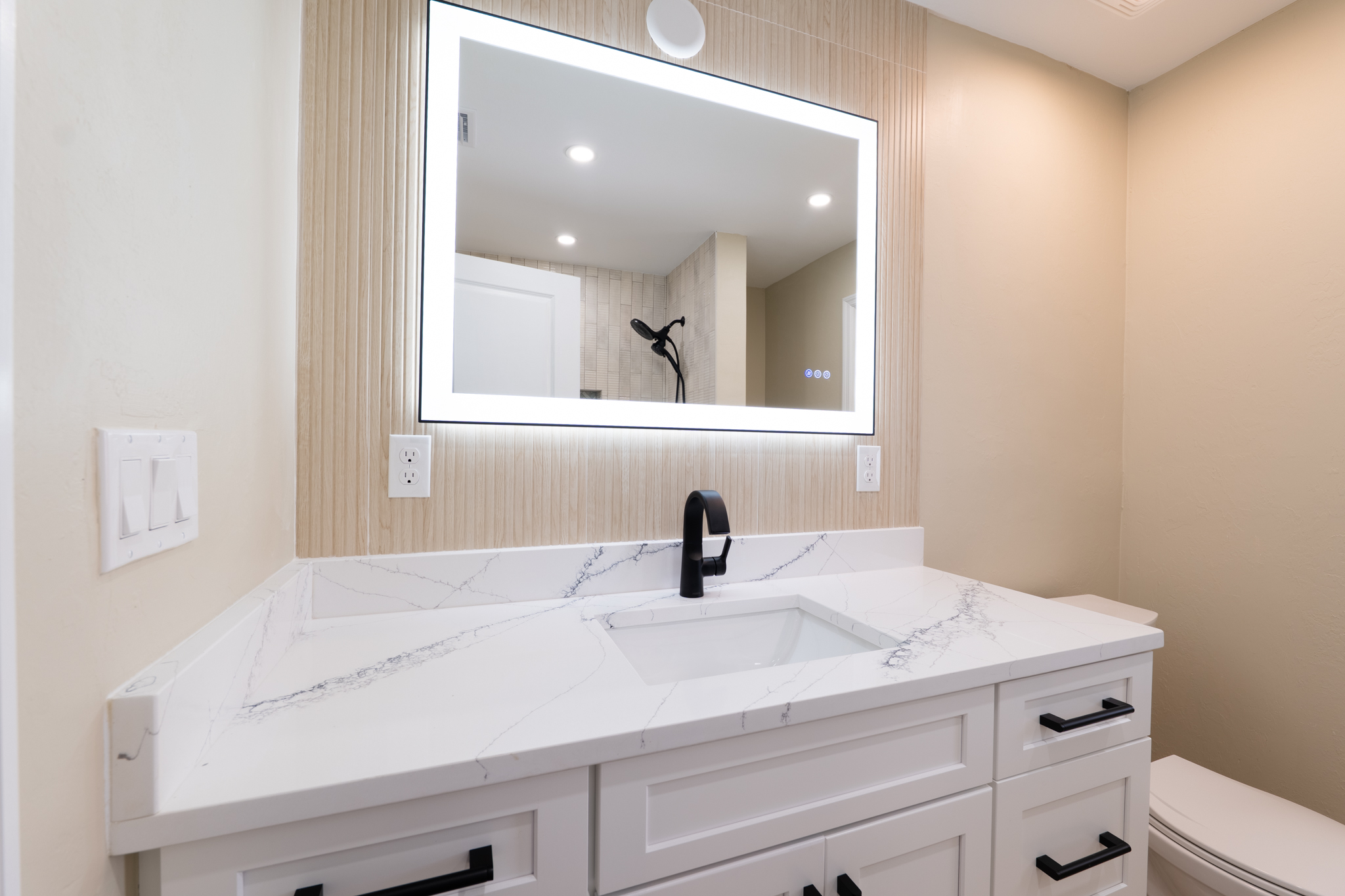 Other highlights include an extra-large shampoo niche and backlit mirror in the bathroom, a custom accent wall in the new office (which can also serve as a fourth bedroom), and a raised kitchen ceiling with over 40 recessed LED lights. The laundry room was expanded and now includes a vanity pre-piped for a future utility sink.