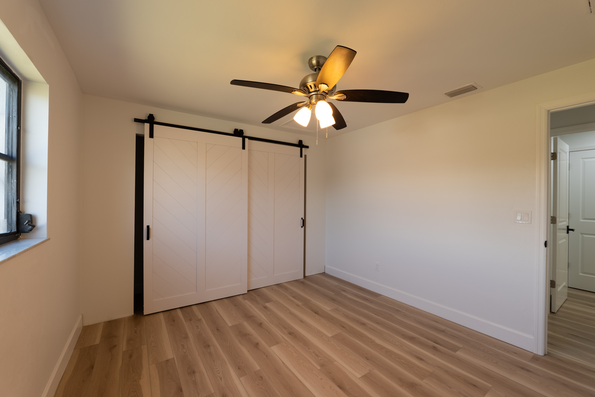 Upgrades also include a new 200-amp electrical service with surge protection, COREtec luxury vinyl flooring throughout, and additional HVAC returns in bedrooms for better airflow. One bedroom was enlarged by adding a custom closet with barn doors that open to the living area. The home was pre-wired for a future fireplace wall and under-cabinet lighting and finished with new double front doors and an extra-wide 42-inch screen door for a welcoming, modern entry.