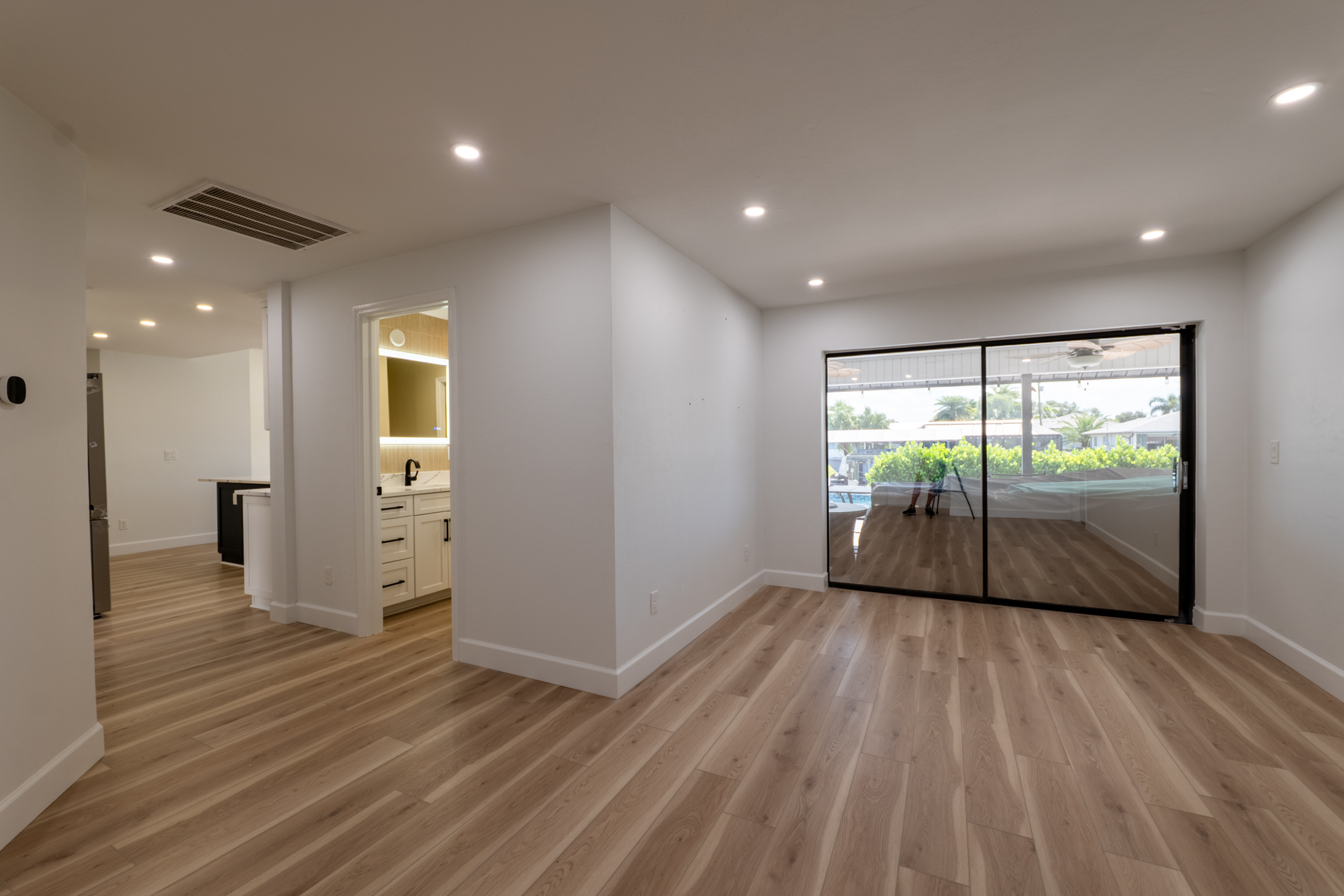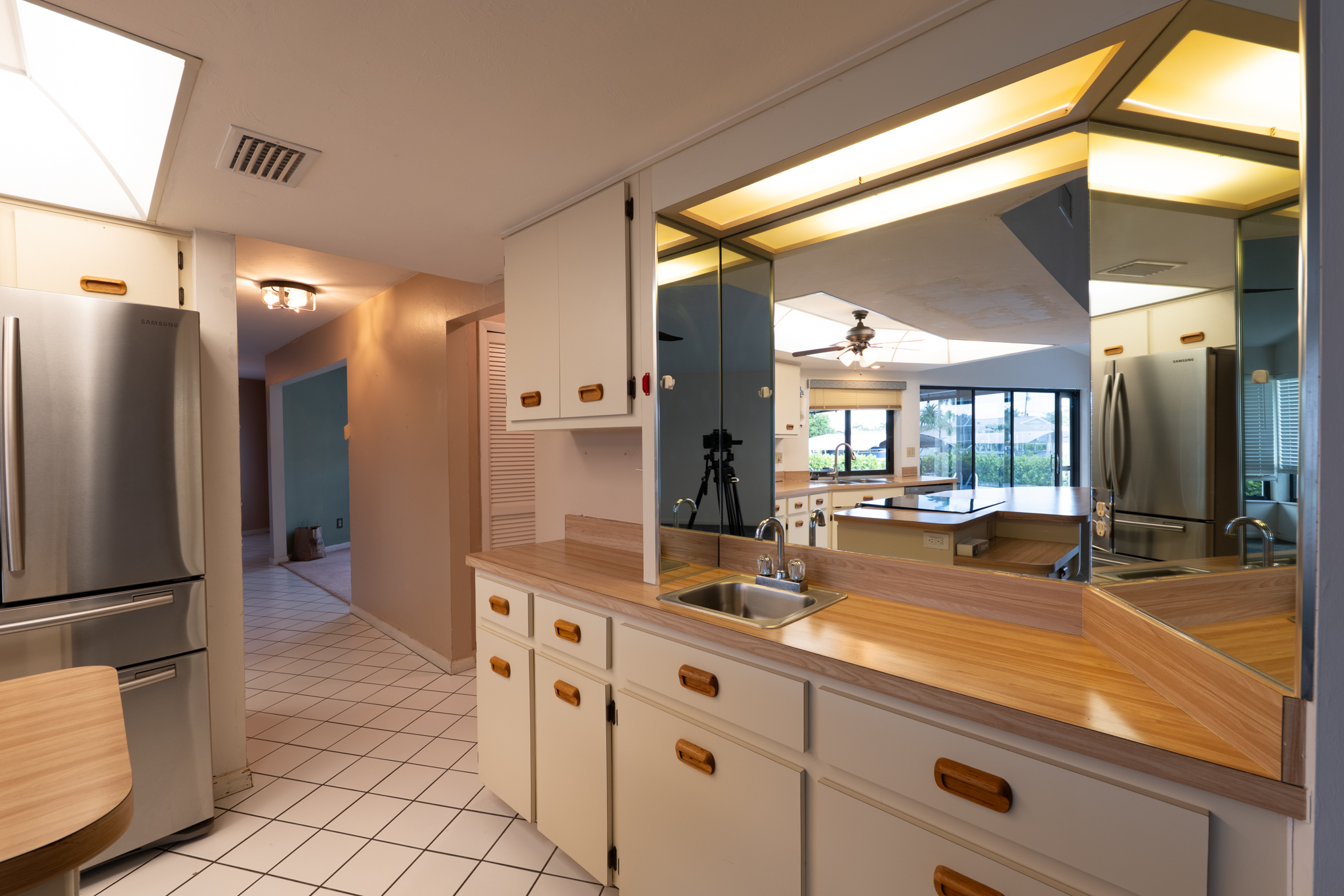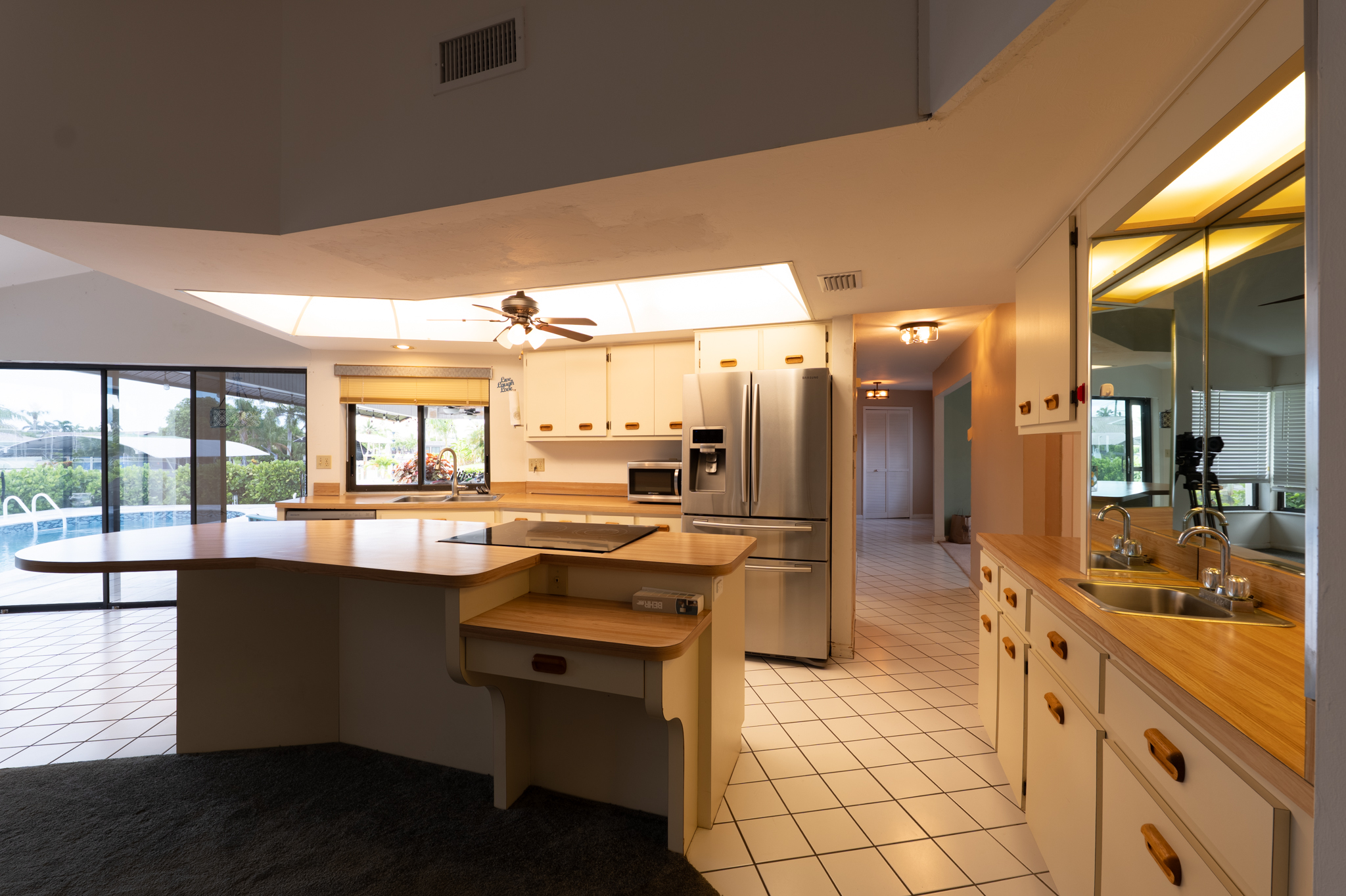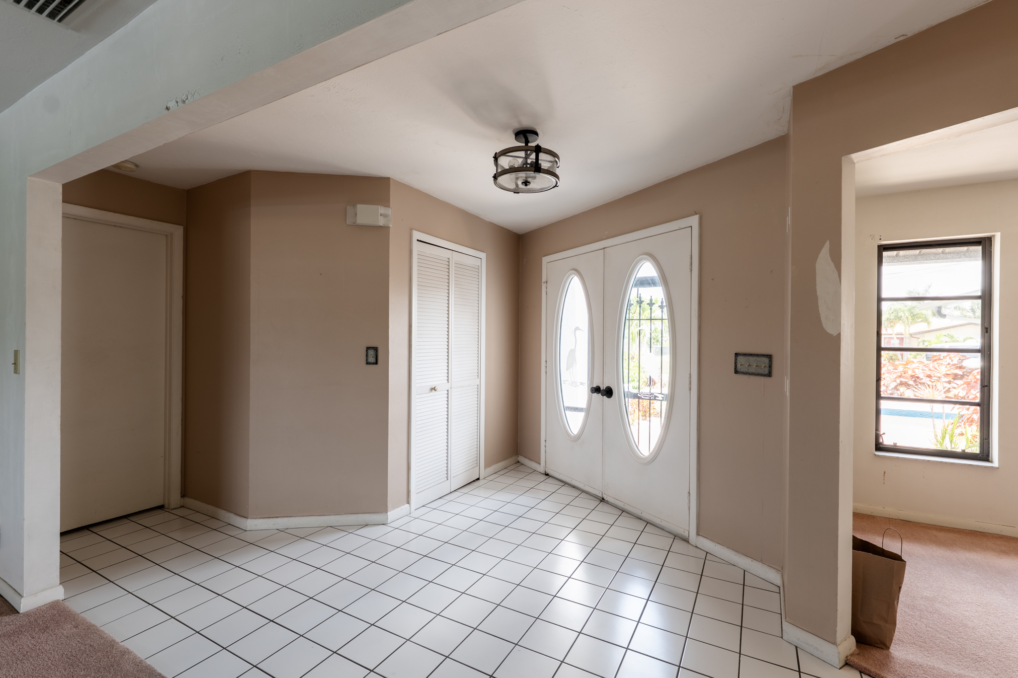 This 1985 home, located in Cape Coral’s Yacht Club area, featured unusual angled walls throughout the interior, including the front entry wall, creating what the owners called the “Fun House” effect. Although the remodel was not flood related, FEMA regulations limited how much of the structure could be altered, so the master bedroom and bath were excluded from this phase.