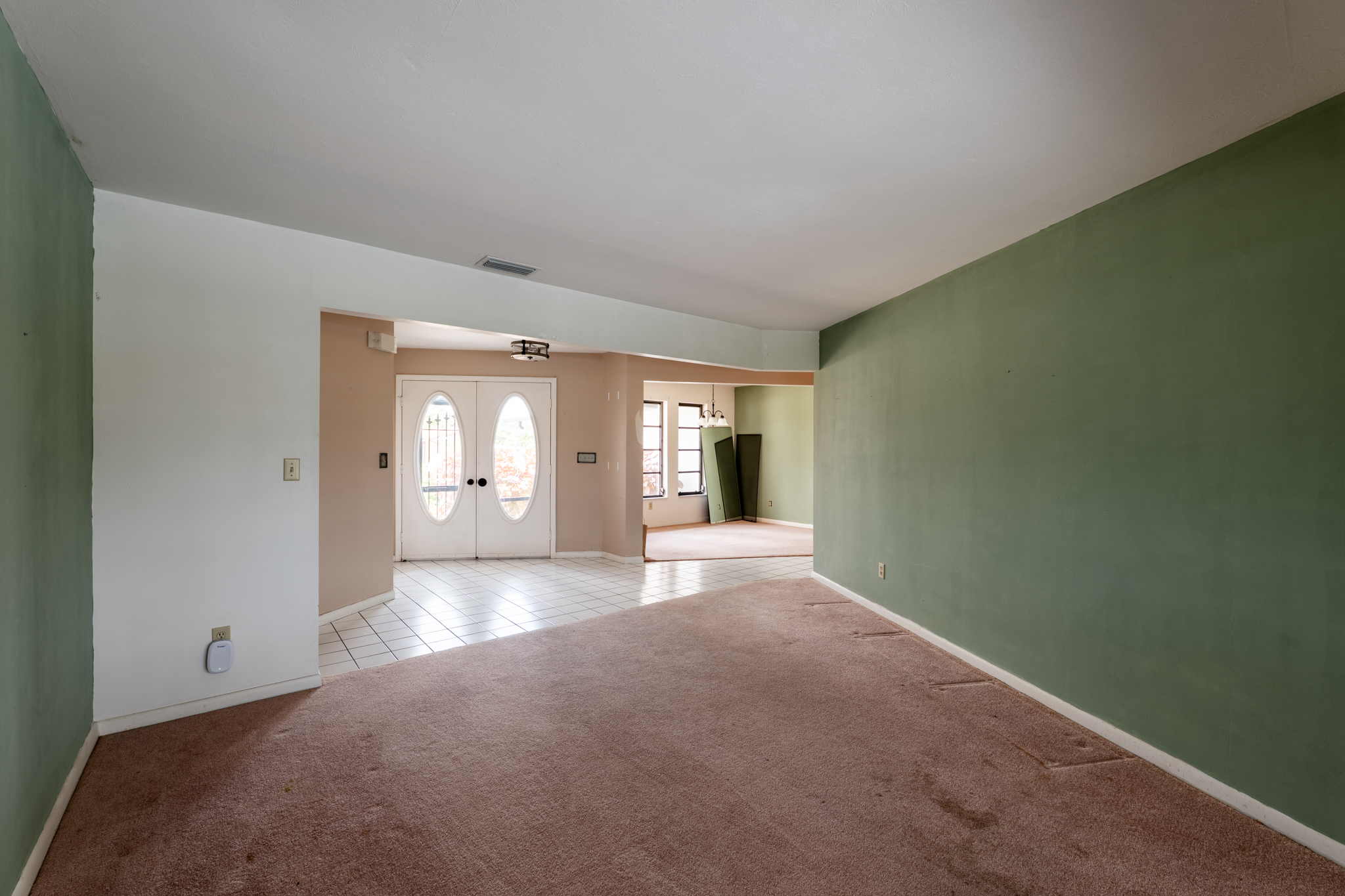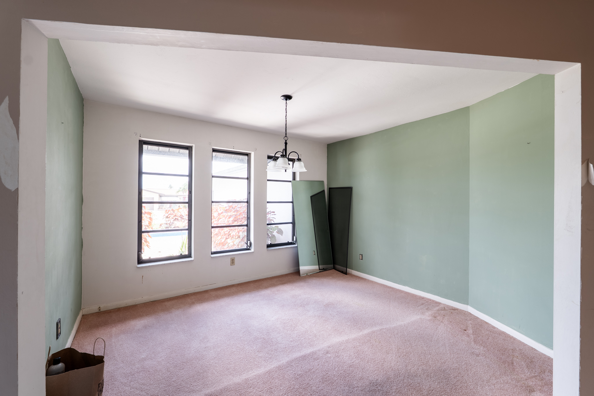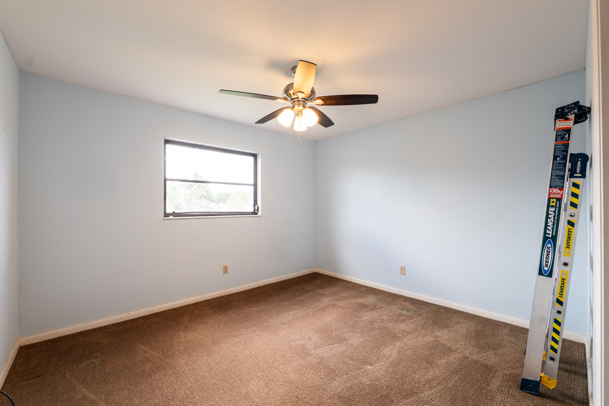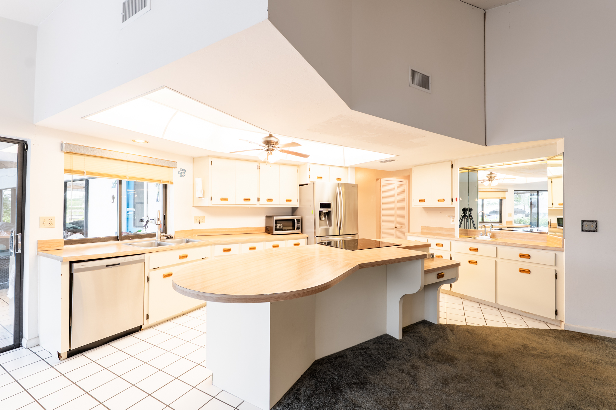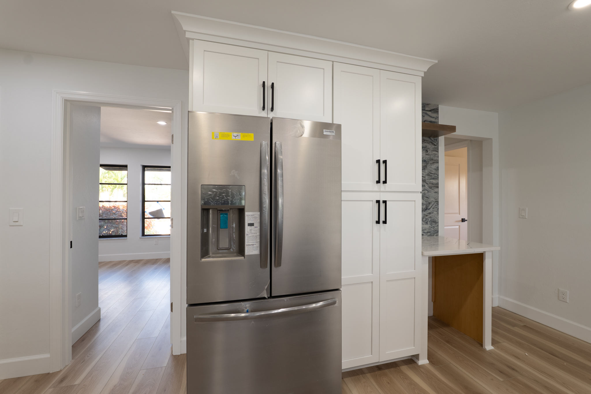 This 1985 home, located in Cape Coral’s Yacht Club area, featured unusual angled walls throughout the interior, including the front entry wall, creating what the owners called the “Fun House” effect. Although the remodel was not flood related, FEMA regulations limited how much of the structure could be altered, so the master bedroom and bath were excluded from this phase.
