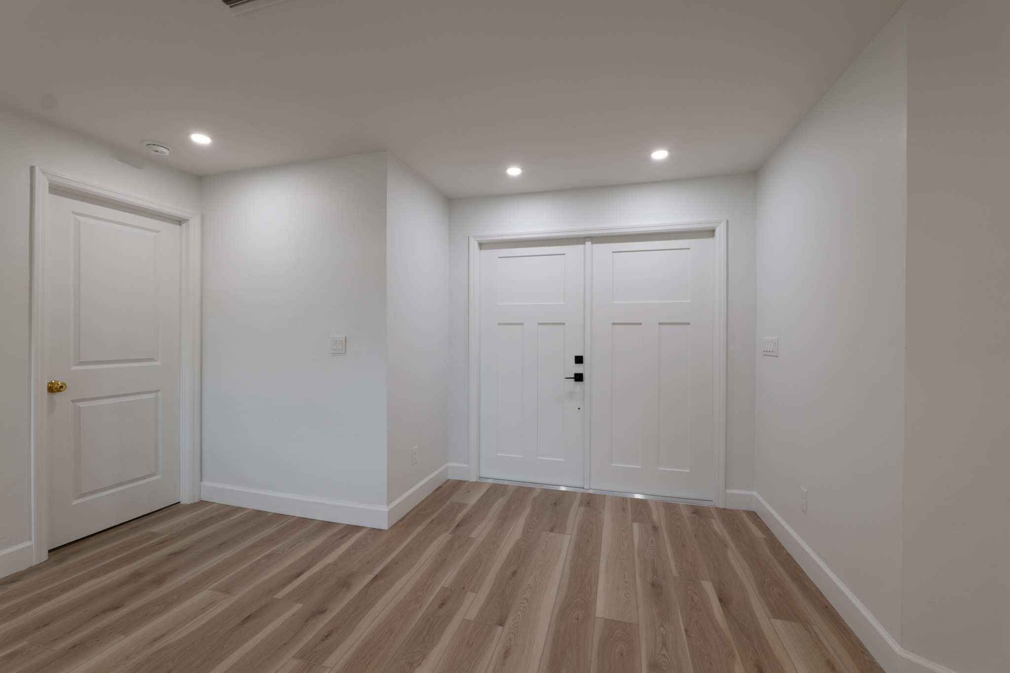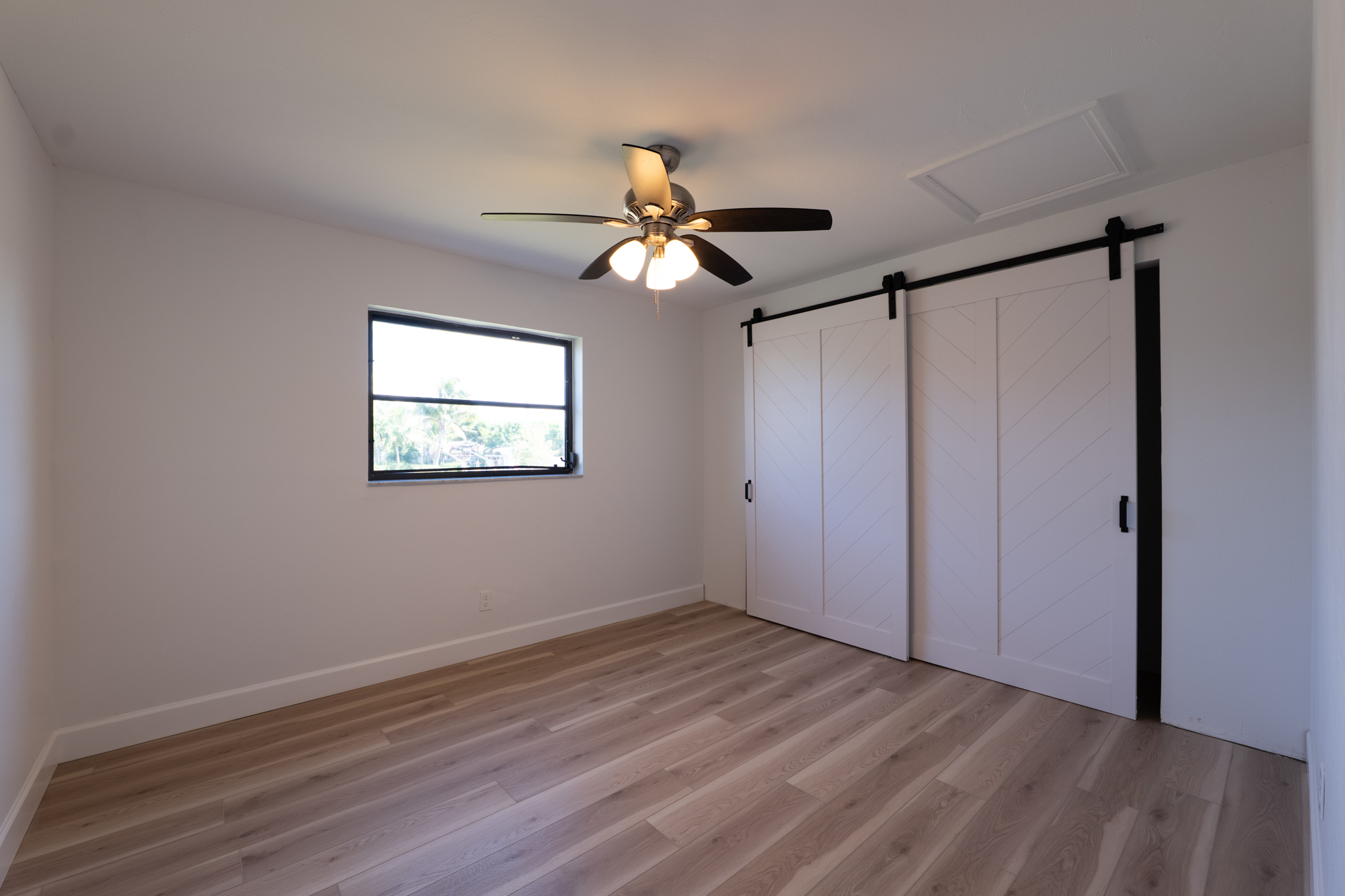 Upgrades also include a new 200-amp electrical service with surge protection, COREtec luxury vinyl flooring throughout, and additional HVAC returns in bedrooms for better airflow. One bedroom was enlarged by adding a custom closet with barn doors that open to the living area. The home was pre-wired for a future fireplace wall and under-cabinet lighting and finished with new double front doors and an extra-wide 42-inch screen door for a welcoming, modern entry.