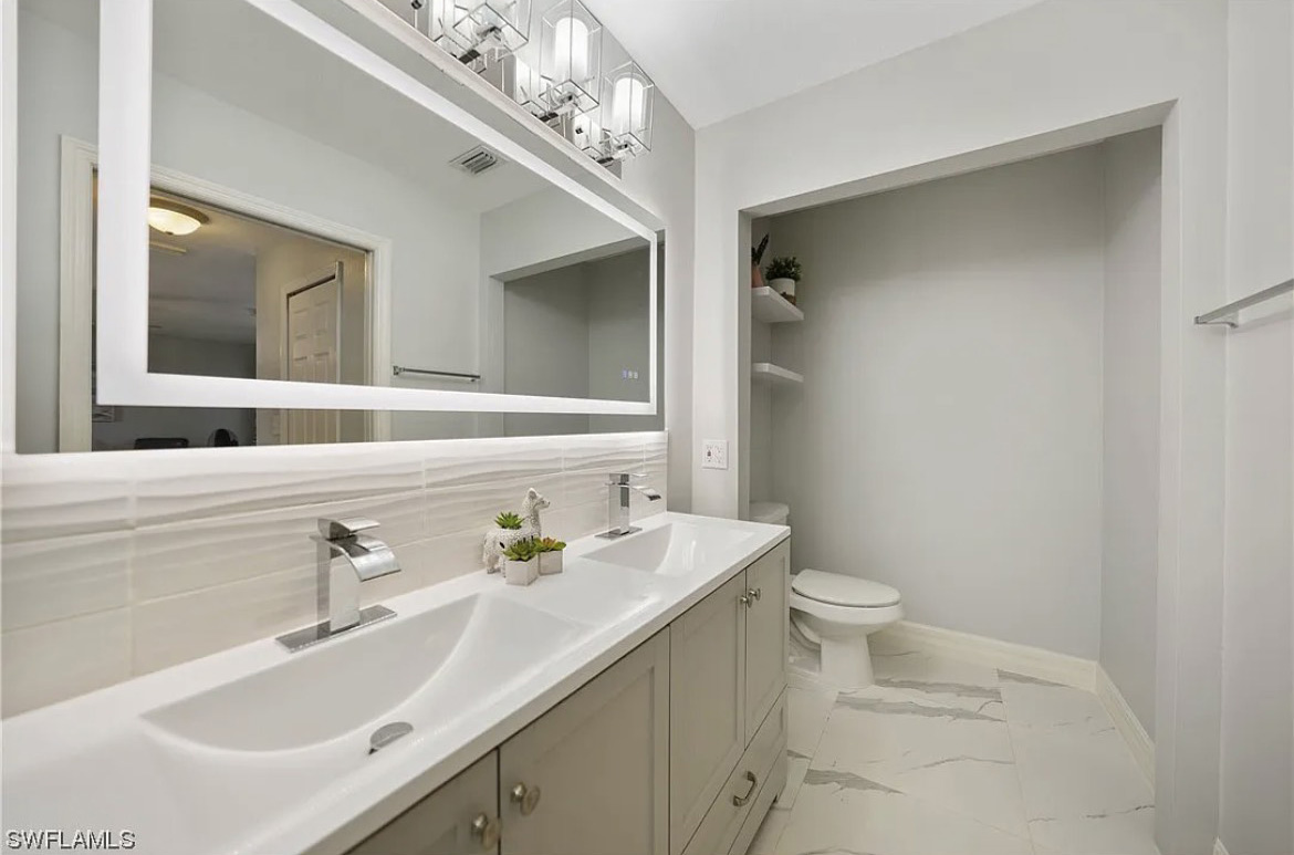 For bath remodels we installed high-tech Toto bidet toilets, new vanities with modern vessel sinks in addition to the new LVP style flooring. We also replaced the previous master bathroom’s exposed toilet with a privacy wall.